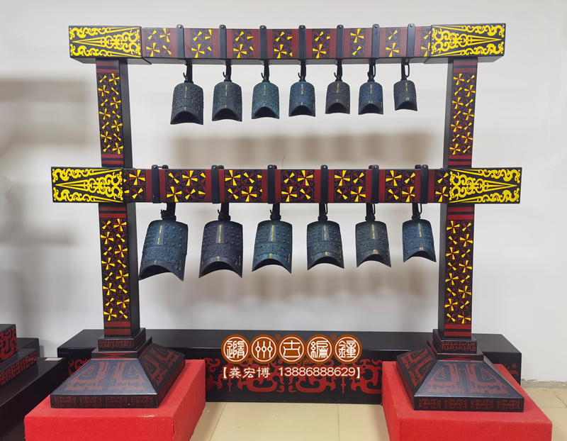 簡介:13件2層古編鐘,是根據(jù)曾侯乙編鐘設(shè)計制作,編鐘為青銅鑄造,采用標(biāo)準(zhǔn)音高A=440Hz調(diào)音,音階G4—A6。編鐘大梁采用優(yōu)質(zhì)松木制作,表面噴漆,彩繪花紋